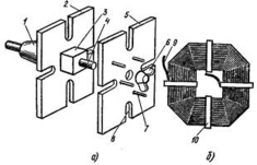 Ремонт бескаркасных катушек. По размерам дефектной катушки изготовляют разъемную оправку (рисунок 7, а). Размер ее с учетом изоляции катушки должен соответствовать сердечнику, для которого предназначена катушка. Оправку устанавливают на токарном станке и закрепляют за деталь 1 или на специальном намоточном приспособлении. На оправку укладывают в четырех местах по периметру тафтяную ленту с таким расчетом, чтобы после намотки катушки ее хватило для устройства бандажа 10 (рисунок 7, б). По тафтяной ленте втулку оправки оборачивают двумя слоями электрокартона толщиной 0,2–0,3 мм и шириной, равной высоте катушки. К началу обмотки припаивают припоем ПОС-30 кусок гибкого медного провода (вывод 9). Место пайки изолируют полоской миканита.