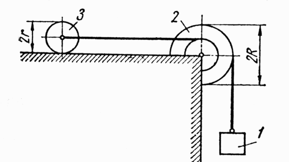 Для заданной механической системы определить ускорения грузов и натяжения в ветвях нитей, к которым прикреплены грузы. Массами нитей пренебречь. Трение качения и силы сопротивления в подшипниках не учитывать. Система движется из состояния покоя.