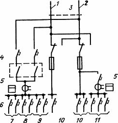 Рис. 6. Схема ВРУ жилого дома высотой 17 и более этажей: 1 — ввод № 1 от ТП; 2 — ввод № 2 от ТП; 3— граница раздела с электроснабжающей организацией; 4 - станция АВР; 5 - расчетный счетчик электроэнергии; 6 — щиток домоуправления; 7 — линии АЭО общедомовых помещений; 8 — питающие линии систем дымозащиты; 9 — питающие линии лифтов; 10 — питающие линии квартир; 11 — линии рабочего освещения общедомовых помещений
