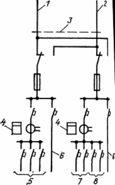 Рис. 5. Схема ВРУ жилого дома высотой 6—9 этажей: 1 — ввод № 1 от ТП; 2 — ввод № 2 от ТП; 3 — граница балансового раздела с электроснабжающей организацией; 4 — расчетный счетчик электроэнергии; 5 — линии рабочего освещении общедомовых помещений; 6 — питающие линии квартир; 7 — АЭО общедомовых помещений; 8 — питающие линии лифтов