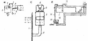 Рис. 1. Схема установки реле уровня для автоматизации работы насосов: а и б — поплавковое реле для открытых и закрытых резервуаров, в — схема автоматического регулирования уровня воды в резервуаре; 1 — резервуар; 2 — поплавок; 3 — блок; 4 — переключающие шайбы; 5— коромысло; 6 — контакты; 7 — груз; 8 - контактный мост; 9 — соединительная труба; 10— насос; 1— подача воды; 12 — баллончик с ртутью; 13 — электродвигатель