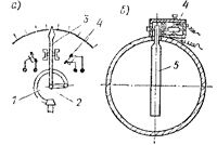Рис. 2. Схема контактного манометра (а) и струпного реле (б): 1 — трубка датчика; 2 — ось стрелки; 3 — стрелка; 4 — контакты; 5 - чувствительная пластинка