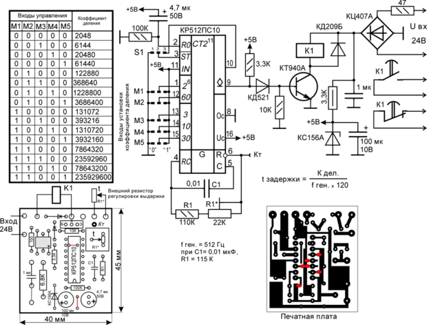 Реле времени собрано на специализированной микросхеме КР512ПС10, очень широко применяемой в подобных устройствах. Точное время задержки срабатывания устанавливается подбором R1 , C1. Для дискретного изменения времени задержки в широких пределах используются входы предустановки коэффициента деления М1 ... М5, назначение которых показано в таблице. Установкой перемычек на плате можно задать время от нескольких секунд до нескольких суток. Перемычка S1 позволяет получить различный режим работы: если замкнуть площадки 1, 2 реле времени будет периодически включаться и выключаться через заданное время, причем время включенного состояния равно времени выключенного состояния. Если замкнуть площадки 2, 3 - реле времени отсчитает заданный интервал и включит выходное реле , которое останется в этом состоянии сколь угодно долго, пока не будет выключено и заново включено напряжение питания. Более удобна микросхема MC14536BCP или CD4536B, которая имеет широкий диапазон напряжения питания - до 18 В, вместо +6 В у КР512ПС10, что позволяет легко встраивать узлы задержки времени в различные устройства автоматики на КМОП микросхемах.
