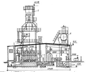 Компоновка котельной полуоткрытого типа: нижняя часть котлов (примерно до высоты 6 м) расположена в здании, а верхняя их часть — на открытом воздухе. Внутри котельной размещаются дутьевые вентиляторы, насосы, а также щит управления. На перекрытии котельной установлен деаэратор 6 для удаления воздуха из воды.