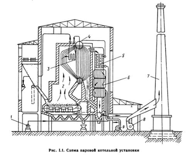 Котельная установка представляет собой комплекс устройств, размещенных в специальных помещениях и служащих для преобразования химической энергии топлива в тепловую энергию пара или горячей воды. Основные элементы котельной установки – котел, топочное устройство (топка), питательные и тягодутьевые устройства.