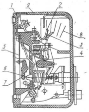 7 - відключаюча рейка; 8 – дугогасильна камера; 9 - кришка