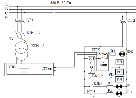 tвст Для свода: Тепловой поток через 1м2 свода: Температура в своде на границе шамот – пенодиатомит: Температура на внешней поверхности свода: Для пода: Тепловой поток через 1м2 пода: Температура в поде на границе шамот – пенодиатомит: Температура на внешней поверхности пода: Мощность потерь через футеровку. Боковые и задняя стенки: Свод: Под: Суммарные потери через футеровку: Тепловой расчёт загрузочной дверцы. Принимаем, что загрузочная дверца на передней стенке печи занимает всю её площадь FДВ=FСР Р=0,243 м2. Теплоизоляцию дверцы выполняем набивкой муллитокремнистым волокном МКРР-130 с допустимой температурой 11500С (табл. 2), толщина набивки S=300мм. Средняя температура набивки Средний коэффициент теплопроводности (табл. 2) λср=0,147 Вт/м2∙0С, Тепловой поток 1м2 дверцы: Температура на внешней поверхности дверцы: Мощность потерь через дверцу: Номинальная мощность печи: Установленная мощность печи: 3 Электрический расчёт Материал нагревателя выбран по результатам нескольких предварительных расчётов. Далее приведён расчёт окончательного варианта. Принимаем в качестве материала нагревателя фехраль Х23Ю5Т, tн=13000С, ρ=1,45 мкОм∙м (табл. 9).При рабочей температуре ρ’=1,08∙1,45=1,566 мкОм∙м. Нагреватель выполняем из ленты a=1мм, d=10мм, ленточный зигзаг с шагом l=10мм (рис. 8): Расчётная площадь поверхности нагревателя: Принимаем печь трёхфазной, соединение нагревателей – звезда, мощность одной фазы: Длина фазы нагревателя: Площадь поверхности трёх фаз нагревателя: Фактическая площадь нагревателя Принципиальная электрическая схема управления печью сопротивления Выбираем автоматический трехполюсный выключатель фирмы LEGRAND LR tm на 32А (6048 38) с отключающей способностью Icu: 6 кA (400 B±).Соответствует ГОСТ Р 50345-99. ■ Техническая информация ● Номинальное напряжение: 240 В± / 415 В± ● Максимальное напряжение: 80 В = на полюс (см. таблицу ниже) ● Допустимое кратковременное напряжение: 500 В± ■ Механические характеристики Стойкость: 20 000 механических циклов 10 000 циклов под нагрузкой = In x cos ϕ 0,9 Допустимые сечения проводников : 25 мм2 гибкие провода 35 мм2 жесткие провода