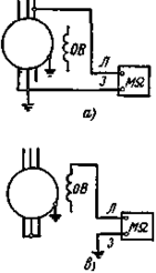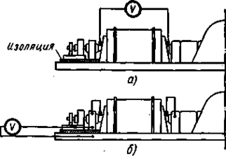 На рис. 2 приведена схема измерения сопротивления изоляции подшипников турбогенератора. Сначала измеряют напряжение на концах вала ротора генератора (рис. 2, а), затем при закороченных масляных пленках в обоих подшипниках измеряют напряжение между основанием изолированного подшипника и фундаментной плитой (рис. 2, б). Если эти напряжения равны, изоляционная прокладка в исправности. Если же второе напряжение значительно меньше первого (более чем на 10%), прокладка неисправна. Напряжение на валу измеряют вольтметром с малым внутренним сопротивлением, со шкалой до 7,5—10 В. Кроме того, у турбогенератора с водородным охлаждением изолируют также со стороны возбудителя корпус, уплотнение вала и подходящие к нему маслопроводы.