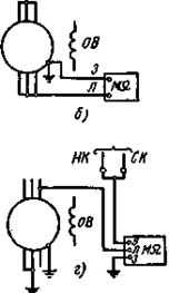Рис. 1. Схемы измерения сопротивления изоляции обмоток генератора мегомметром: а — фазы обмотки статора относительно корпуса и двух заземленных фаз, б — всех фаз обмотки статора, в — обмотки ротора относительно корпуса, г — фазы обмотки статора генератора с непосредственным водяным охлаждением относительно корпуса и двух других фаз; НК — напорный коллектор, СК — сливной коллектор