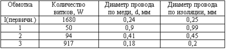 Находим диаметры проводов вторичных обмоток. Для этого составляем таблицу намоточных данных, где диаметры проводов по меди выбраны из ближайших больших стандартных значений, а диаметры проводов в изоляции взяты на 10% больше, чем диаметры проводов по меди, табл. 4.
