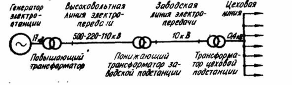 Распределение электрической энергии между промышленными предприятиями, населёнными пунктами, в городах и сельских местностях, а также внутри промышленных предприятий производится по воздушным и кабельным линиям, при напряжении 220, 110, 35, 20, 10 и 6 кВ. Следовательно, во всех распределительных узлах должны быть установлены трансформаторы, понижающие напряжение до величины 220, 380 и 660 В (рис. 6)