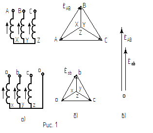 П о данной схеме и группы соединений Y/Yо-12 имеем: на высокой стороне обмотки соединены звездой, на низкой стороне обмотки соединены звездой с выводом нулевой точки обмотки (рис .1а). Сдвиг фаз между высокой стороной низкой 0о(рис .1в).Звезда фазных э.д.с. и треугольники линейных имеют вид показанный на рис. 1б.