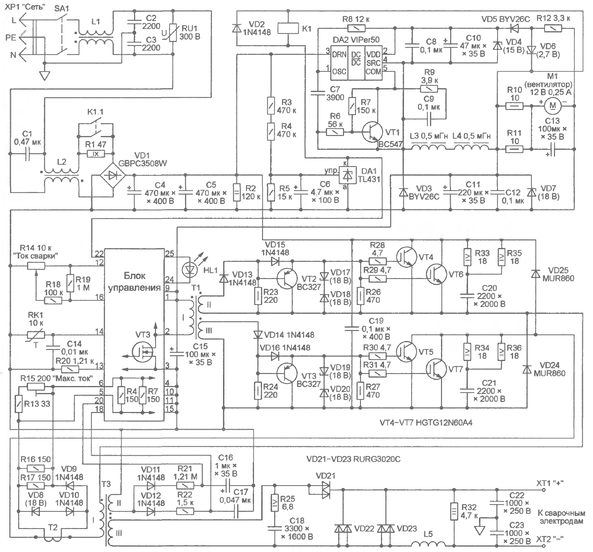 Импульсное напряжение с обмотки III трансформатора ТЗ поступает в сварочную цепь через однополупериодный выпрямитель — диодную сборку VD21. Цепь R25C18 подавляет паразитные высокочастотные колебания. Дроссель L5 сглаживает выпрямленный ток. В паузах между импульсами сварочный ток течет через диодные сборки VD22 и VD23. Резистор R32 — минимальная нагрузка, необходимая инвертору в режиме холостого хода. Конденсаторы С22 и С23 образуют с дросселем L5 фильтр, подавляющий высокочастотные помехи, проникающие на выход сварочного источника. Ток сварки устанавливают переменным резистором R14. Терморезистор RK1 с отрицательным температурным коэффициентом сопротивления закреплен на теплоотводе IGBT VT4—VT7.