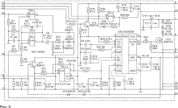 Схема БУ источника COLT1300 изображена на рис. 3. Он построен на ШИ контроллере SG3525A [4], назначение выводов которого приведено в таблице.
