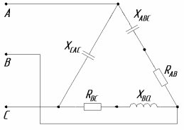 220 В включен треугольником несимметричный приемник, сопротивления которого равны: