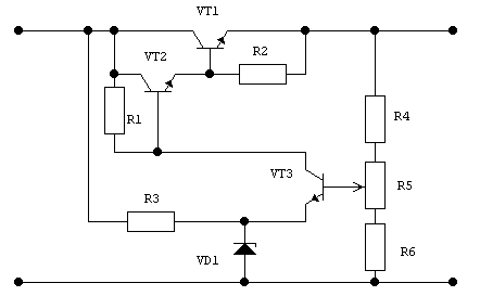 Напряжение стабилитрона VD1 выбираем в пределах 6…8 В, ноо при этом напряжение коллектор- эммитер транзистора VT3 должно быть не менее 3В, то есть