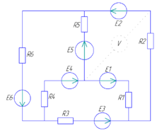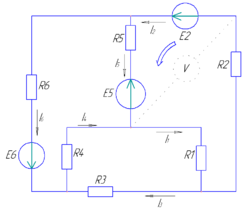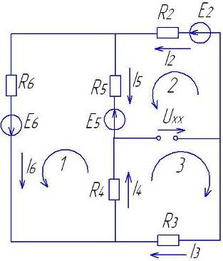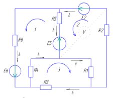 n2=B-у+1-BI=6–4+1=3; n2 – количество уравнений по 2-му закону Кирхгофа