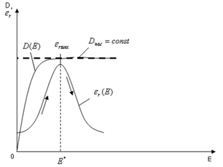 При наложении электрического поля ситуация существенно изменяется. В этом случае начинается преимущественная ориентация элементарных электрических моментов в каждом из доменов по направлению действующего поля, электрическая индукция и увеличивается. Однако, при некотором значении напряженности электрического поля может произойти насыщение, т.е. элементарные электрические моменты в каждом из доменов принимают направление действующего электрического поля, дальнейший рост электрической индукции прекращается и она достигает , а диэлектрическая проницаемость с этого момента начинает уменьшаться (см. рис. 1.8) .