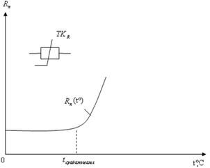 Это явление используется в создании специальных терморезисторов с положительным температурным коэффициентом сопротивления, которые называются позисторами. Температурная зависимость электрического сопротивления позисторов приближается к релейной, т.е. при достижении температуры срабатывания их величина электрического сопротивления увеличивается на несколько порядков, что может быть использовано для самоограничения тока в электрической цепи (см. рис. 1.10).