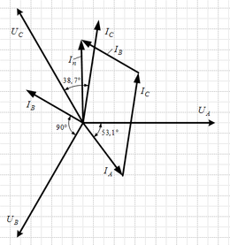 3. Для построения векторной диаграммы выбираем масштабы по току: 1см – 2 А, по напряжению: 1 см – 20 В. Построение диаграммы начинаем с векторов фазных напряжений , и , располагая их под углом 120 друг относительно друга. Ток отстает от напряжения на угол , ток отстает от напряжения на угол , а ток отстает от напряжения на угол (рис.3).