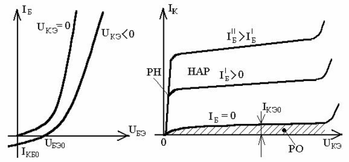 Вторая характеристика на рисунке 2,а (UКЭ < 0) относится к нормальному активному режиму, для получения которого напряжение UКЭ должно быть в p-n-p транзисторе отрицательным и по модулю превышать напряжение UЭБ. В этом случае UКБ = UКЭ + UЭБ = UКЭ - UБЭ < 0.