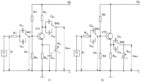 Рисунок 3—Электрическая схема усилительных каскадов с общим эмиттером (а) и с общим коллектором (б)