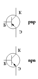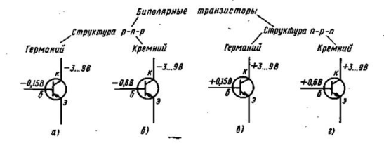 На рисунке показаны условные графические обозначения транзисторов той и другой структуры, выполненных на основе германия и кремния, и типовое напряжение смещения. Электроды транзисторов обозначены первыми буквами слов: эмиттер – Э, база – Б, коллектор – К. Напряжение смещения (или, как принято говорить, режим) показано относительно эмиттера, но на практике напряжение на электродах транзистора указывают относительно общего провода устройства. Общим проводом в устройстве и на схеме называют провод, гальванически соединенный с входом, выходом и часто с источником питания, т.е. общий для входа, выхода и источника питания.
