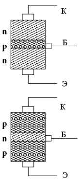 Биполярный транзистор – трехэлектродный полупроводниковый прибор, один из типов транзистора. Электроды подключены к трём последовательно расположенным слоям полупроводника с чередующимся типом примесной проводимости. По этому способу чередования различают n-p-n и pnp транзисторы (n (negative) – электронный тип примесной проводимости, p (positive) – дырочный). В биполярном транзисторе, в отличие от других разновидностей, основными носителями являются и электроны, и дырки (от слова «би» – «два»). Схематическое устройство транзистора показано на втором рисунке.