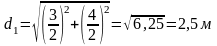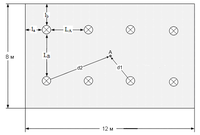 Для расчета намечаем контрольную точку А. Необходимо найти d1, d2 – проекции расстояния на потолок между точкой А и соответствующим светильником.
