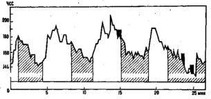 Величина нагрузок, представляющих собой физические и эмоциональные напряжения, характеризуется чрезвычайной изменчивостью и зависит от многих факторов: личной и командной технико–тактической и физической подготовленности, значимости и масштабности соревнований, реакции зрителей и партнеров по команде, неполного восстановления от предшествующих игр. Как показывают данные исследований, частота сердечных сокращений (ЧСС) даже у запасных игроков в момент остроконфликтных игровых ситуаций достигает 130— 150 уд/мин. Поэтому увеличение частоты сердечных сокращений у полевых игроков до 180—200 уд/мин (рис. 1.1) не всегда объясняется адекватностью физических нагрузок. В значительной степени ее можно отнеси за счет повышения эмоциональной напряженности. Тем не менее, многократное выполнение прыжков при блокировании и нападающих ударах оказывает значительное воздействие на нервно-мышечный аппарат, вызывай чрезвычайно высокие сдвиги в деятельности сердечнососудистой и дыхательной систем волейболиста. Достаточно сказать, что после серии из 15—20 прыжков до отказа у спортсмена наступает утомление, и он не может продолжать упражнение.