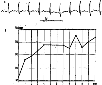 Рис. 1.1. Телеэлектрокардиограмма волейболиста высокой квалификации, снятая во время игры (а), и пульсограмма радиотелеметрической регистрации частоты сердечных сокращений (б)