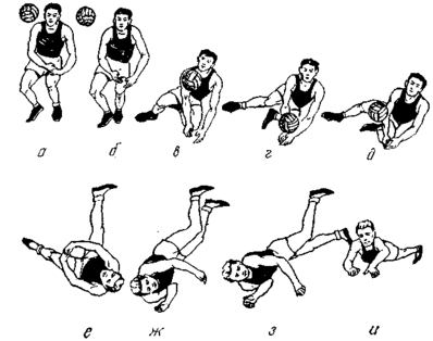 Техника приема мяча с падением-перекатом на спину заключается в следующем. Игрок, определив траекторию полета мяча, делает широкий шаг-выпад в сторону его полета (рис. 2.4, а, б), опуская туловище к бедру опорной ноги (рис. 2.4, в). Сзади стоящая йога — прямая и касается внутренним сводом стопы поверхности площадки. Руки волейболиста выпрямлены (кисти соединены вместе), вытянуты вперед-вниз и проходят над коленным суставом опорной ноги на выпаде. Взгляд игрока обращен на мяч. Затем волейболист, увеличивая сгибание правой ноги, смещает туловище за опору, отрывает от поверхности площадки сзади стоящую ногу и подбивает опускающийся мяч (рис. 2.4, г). После этого следует приземление на бедро — таз (рис. 2.4, д), перекат на спине (рис. 2.4, е) и переворот через правое плечо с выходом в положение упора лежа (2.4, ж, з, и). Перекат с последующим за ним переворотом осуществляется благодаря развиваемой туловищем инерции, получаемой в результате – быстрого снижения ОЦТ, выведения его за опору и отталкивания от нее в момент приема мяча. Из положения упора лежа волейболист, может быстро встать на ноги и включиться в игру.