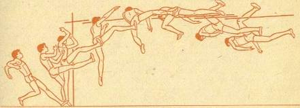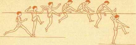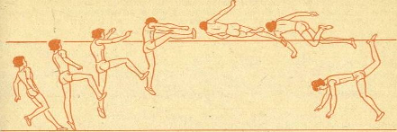 Полет и приземление. Движения спортсмена в полете зависят от применяемого им способа прыжка. «Перешагивание» (рис. 2) – наиболее простой для освоения способ, который применяется на начальных этапам обучения и с которым чаще всего имеет дело преподаватель физической культуры в школе. Разбег выполняется под углом 35 – 450, а отталкивание в 50 – 80 см от планки. Прыгун находится боком к планке и, выполняя толчок дальней от ямы для приземления ногой, делает затем широкий мах свободной ногой и руками. Во время взлета толчковая нога некоторое время свободно опущена вниз, а затем, сгибаясь коленом вверх, подтягивается к планке. Туловище занимает вертикальное положение, а в конце взлета несколько наклоняется вперед – внутрь. Руки опускаются вниз по обеим сторонам планки. Движения перешагивания заключаются в том, что маховая нога энергичным движением опускается вниз за планку, а толчковая, разгибаясь в колене, переносится через планку с поворотом наружу. Туловище при этом поворачивается к толчковой ноге.