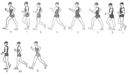 Чтобы ознакомиться с техникой спортивной ходьбы, достаточно рассмотреть один цикл движений (рис. 1). В спортивной ходьбе, как и в обычной, чередуются одноопорные и двухопорные положения. Рассматривать технику спортивной ходьбы удобнее с одноопорного положения скорохода в момент вертикали, когда ОЦМТ находится точно над опорной ногой. В этом положении опорная нога выпрямлена. Другая нога (маховая) в согнутом положении выносится бедром вперед и несколько вверх. Одновременно с продвижением ОЦМ тела вперед опорная нога переходит из вертикального положения в наклонное, оставаясь по-прежнему выпрямленной.