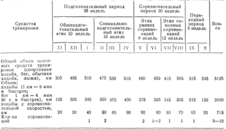 Контрольные упражнения: спортивная ходьба 3 км – 12. 50,0–13. 00,0; спортивная ходьба 5 км – 21. 50,0–22. 00,0; спортивная ходьба 10 км – 44. 40,0–45. 30,0; бег 3000 м – 8. 56,0–9. 10,0; тройной прыжок с места – 7,50–7,70; бросок набивного мяча – 13,00–13,50 м; лыжи 10 км – 34,30–36,30.