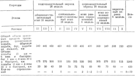 Подготовительный период продолжается 26 недель и состоит из общеподготовительного (10 недель) и специально-подготовительного (16 недель) этапов (табл. 1).