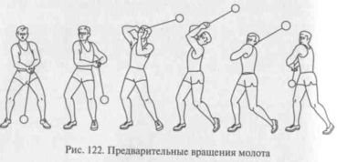 Предварительные вращения следует выполнять в полуприседе, перенося вес тела с одной ноги на другую, в направлении, противоположном положению молота (рис. 2).