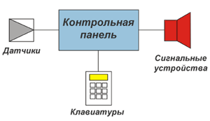 Центром системы является контрольная панель, которая производит обработку данных с датчиков, клавиатур и активирует сигнальные устройства в случае тревоги.
