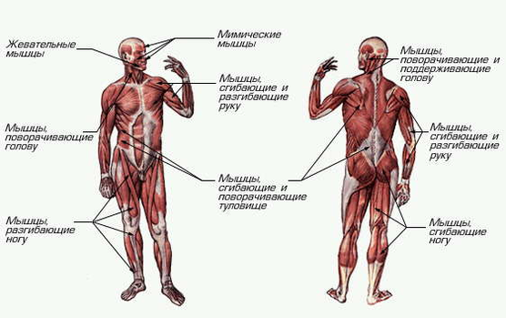 Опорно-руховий апарат складається з кісткового кістяка й м'язів. М'яза людини діляться на три види: гладка мускулатура внутрішніх органів і посудин, що характеризується повільними скороченнями й великою витривалістю; поперечнополосата мускулатура серця, робота якої не залежить від волі людини, і, нарешті, основна м'язова маса - поперечнополосатая кістякова мускулатура, що перебуває під вольовим контролем і забезпечує нам функцію пересування.
