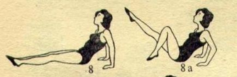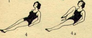 И.П.- сидя на полу, руки в упоре на предплечьях, на каждый счет сгибание и разгибание ног в коленях (как вариант: поднимание прямых ног до угла и медленное опускание). 4-5 раз.