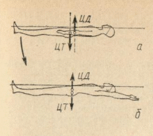 Если погружающая и выталкивающая силы приложены не по одной линии, то они образуют пару сил (рис.5, а). Обычно ОЦТ тела пловца (при положении на спине с вытянутыми вдоль туловища руками) расположен ближе к ногам, чем центр объема вытесненной воды (центр давления - ЦД). В этом положении нижняя часть тела опускается вниз. Чтобы сохранить горизонтальное положение (уравновеситься), следует руки вытянуть за головой, что переместит ОЦТ тела пловца к головной части тела (рис.5, б). Если в этой позе ноги опускаются вниз, можно приподнять кисти и предплечья над водой, в результате ЦД переместится к ногам, но тогда выталкивающая сила может оказаться меньше погружающей и пловец, уравновесившись, уйдет в воду глубже.