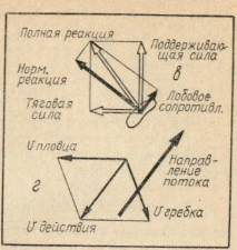 Рис.5. Уравновешивание тела пловца в воде: а - отсутствие равновесия; б - уравновешенное положение; в - образование тяговой силы; г - образование скорости гребущей поверхности (действия) на воду