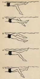 Основная роль движений ногами при плавании на спине - удержать тело спортсмена в обтекаемом положении, усилить отдельные фазы гребка руками, а также непосредственно внести свою долю в создание сил, продвигающих пловца вперед. Ноги выполняют, как отмечалось выше, попеременные движения вверх и вниз. В движения вовлечены бедра, голени, стопы (рис.3).