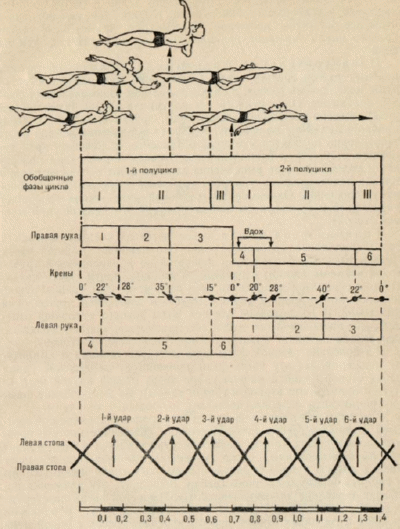 Обобщенные фазы цикла: I - предварительная, II - главная, III - заключительная. Фазы движений рук: 1 - захват, 2 - подтягивание, 3 - отталкивание, 4 - выход из воды, 5 - движение над водой, 6 - вход в воду