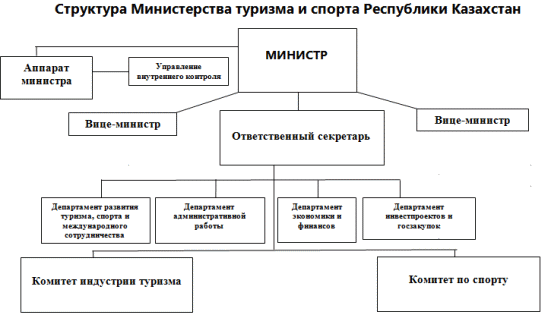 Одним из основных органов регулирования развития туризма в РК является Министерство туризма и спорта Республики Казахстан. Свою деятельность Министерство осуществляет согласно Положению, утвержденного Правительством РК от 26 апреля 2006 года №329 (см. Приложение 1) [8].