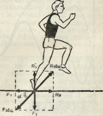 Лучшие условия для наращивания скорости достигаются, когда ОЦМТ бегуна в большей части опорной фазы находится впереди точки опоры. Этим создается наиболее выгодный угол отталкивания, и значительная часть усилий, развиваемых при отталкивании, идет на повышение горизонтальной скорости.