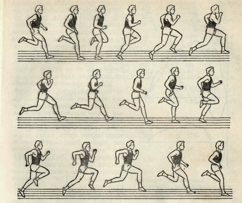 При анализе беговых движений достаточно рассмотреть один цикл бегового движения (характер и последовательность движений отдельных звеньев и всего тела), включающий в себя двойной шаг (шаг с правой и с левой ноги).