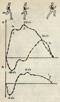 Сила реакции опоры в беге является переменной как по величине, так и по направлению. Она равна по величине и направлена противоположно силе отталкивания ноги от грунта. Сила эта зависит от массы тела бегуна, от скорости бега и от мышечных усилий, развиваемых спортсменом. Направление силы реакции опоры в беге непрерывно изменяется в различные моменты и фазы опорного периода (рис. 8).