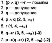 Кроме этих прямых правил получения новых строк вывода, в СНВ приняты непрямые правила, определяющие стратегию построения вывода. Например, если нужно вывести из посылок формулу вида импликации (Х1→(X2 →... (Xn-1→Xn))), то после выписывания посылок выписываются в качестве допущений все антецеденты заключения, начиная с антецедента главного знака импликации, т. е. Х1,X2, X3...,Xn-1. Если при этом удастся вывести Xn, то по непрямому правилу