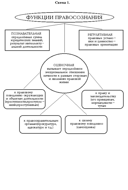 Согласно теоретической концепции, разделяемой многими авторами, основные функции правосознания - познавательная, оценочная и регулятивная. (см. схему 1.) Все другие функции практически охватываются ими, в частности информативная, прогностическая и пр. Схема 1 наглядно показывает, как правосознание осуществляет воздействие на личность и общественные отношения, необходимо только отметить, что результатом регулятивной функции является поведенческая реакция субъекта права в виде правомерного или противоправного поведения.